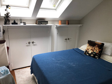 This transformation is one of my favorites. The room is tucked under the attic line, and the sunlight let in by the double skylights makes this room one of the most cheerful in their home. They wanted to be able to take advantage of that to read, relax, and listen to records.